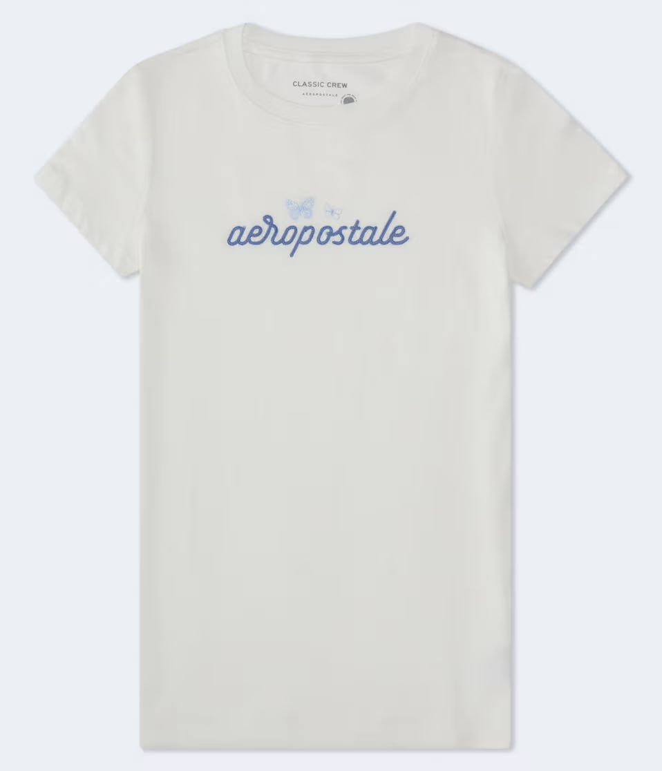 Camiseta Feminina, Branca com Logo e Borboletas Azul, Aéropostale
