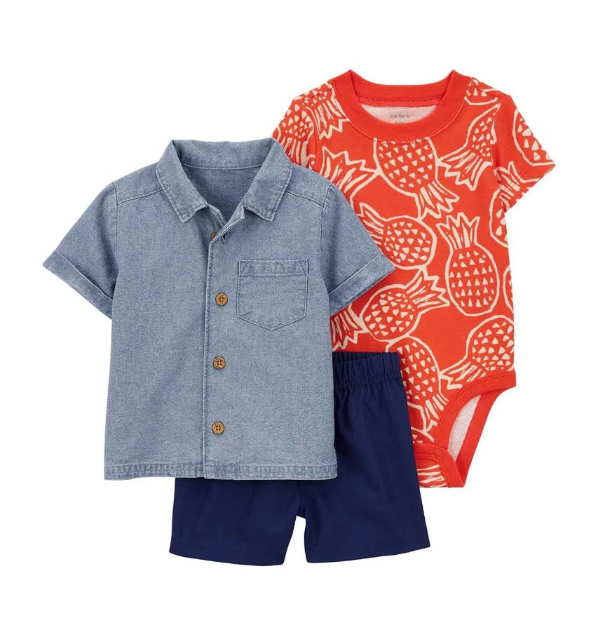 Conjunto de Bebê 3 Peças com Camisa Jeans, Body Estampado e Short Azul, Carter’s
